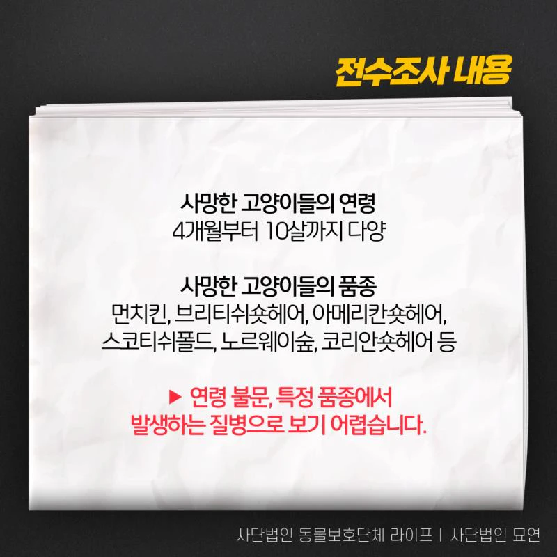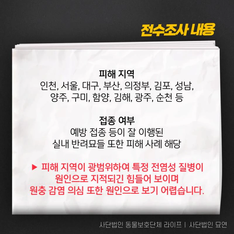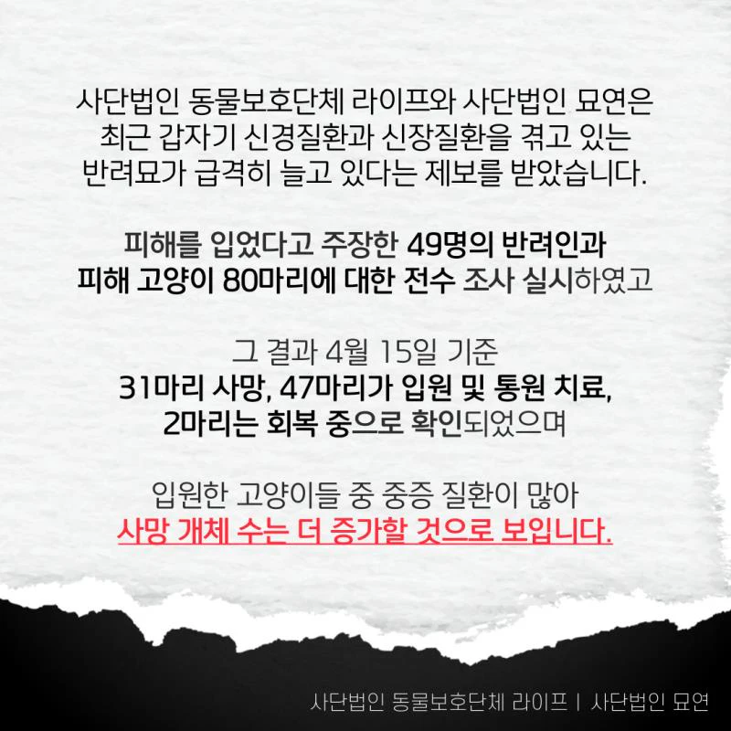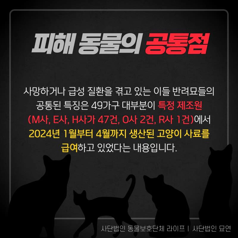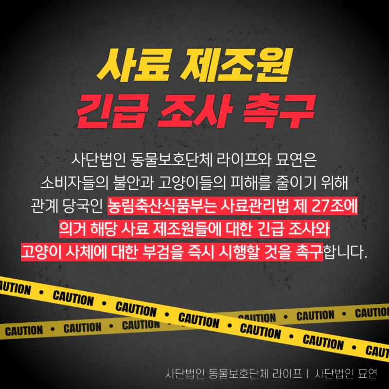 - 정보 부족으로 인한 불안감 증폭: 명확한 정보 부족으로 인해 소비자들은 불안감을 느끼고 있으며, 어떤 사료를 선택해야 하는지 혼란스러워하고 있습니다. 이에 동물보호단체 라이프와 사단법인 묘연은 자체 제보를 받아 데이터를 수집 중이며, 이를 바탕으로 사료 제조원에 대한 긴급조사를 촉구하고 있습니다.